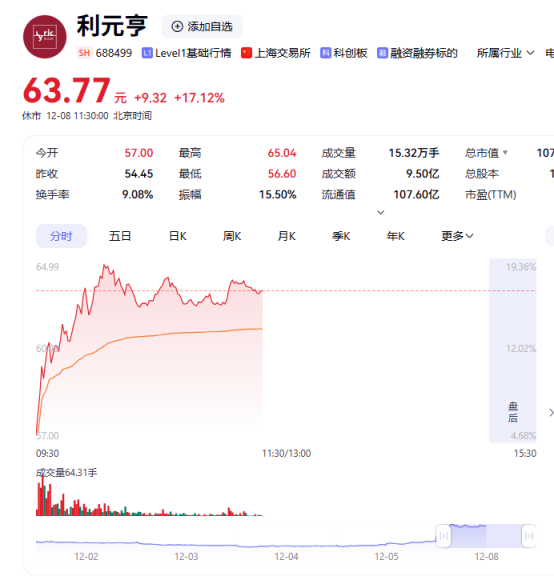 上证报中国证券网讯(李子健 记者 周亮)12月8日,利元亨股价高开高走,盘中一度涨超19%,截至午间收盘,利元亨股价上涨超17%,报63.77元/股。