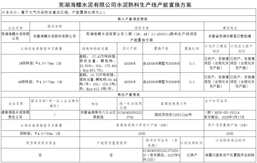 日前,安徽省工业和信息化厅发布《关于芜湖海螺水泥有限公司水泥熟料生产线产能调整置换的公示》称,根据《水泥玻璃行业产能置换实施办法(2024年本)》等文件要求,芜湖海螺水泥有限公司拟将3#、4#水泥熟料生产线(产能均为4500t/d)通过补产能方式将产能增加到5000t/d,置换产能来自淮南舜岳水泥有限责任公司,置换比例为2:1。产能调整置换方案实施后,淮南市将退出1条2000t/d水泥熟料生产线。现将产能调整置换方案予以公示。