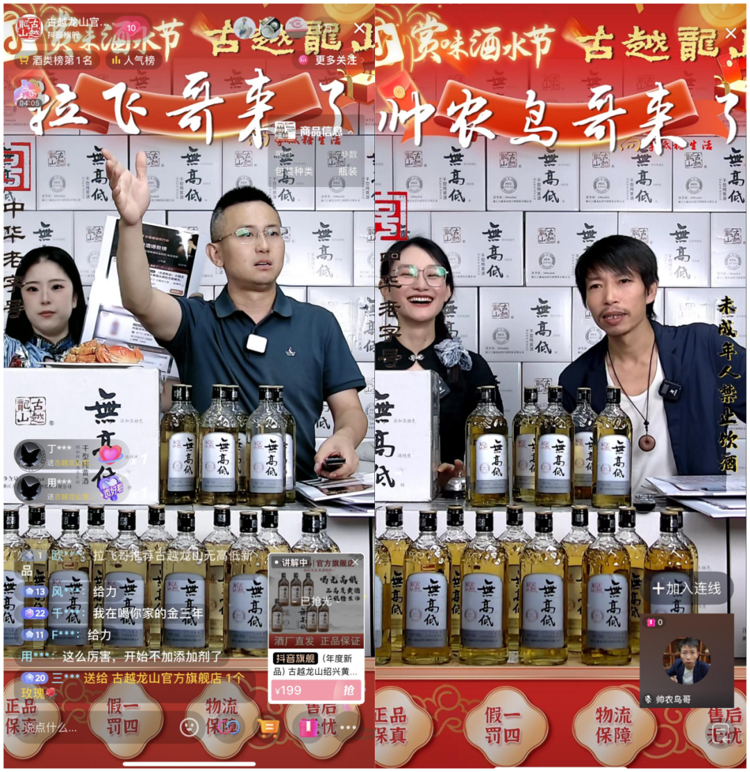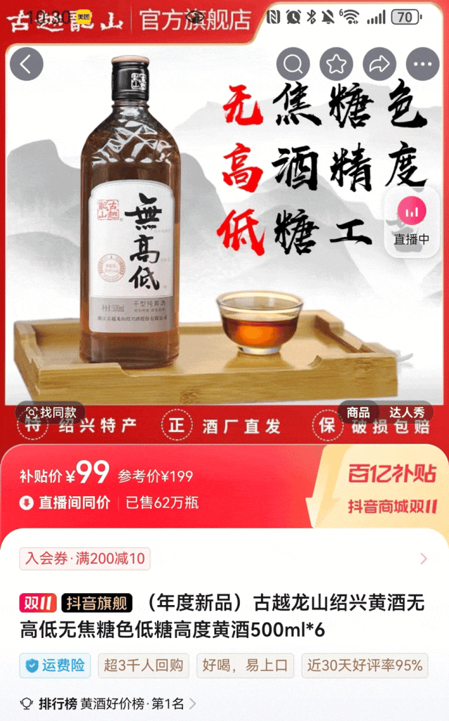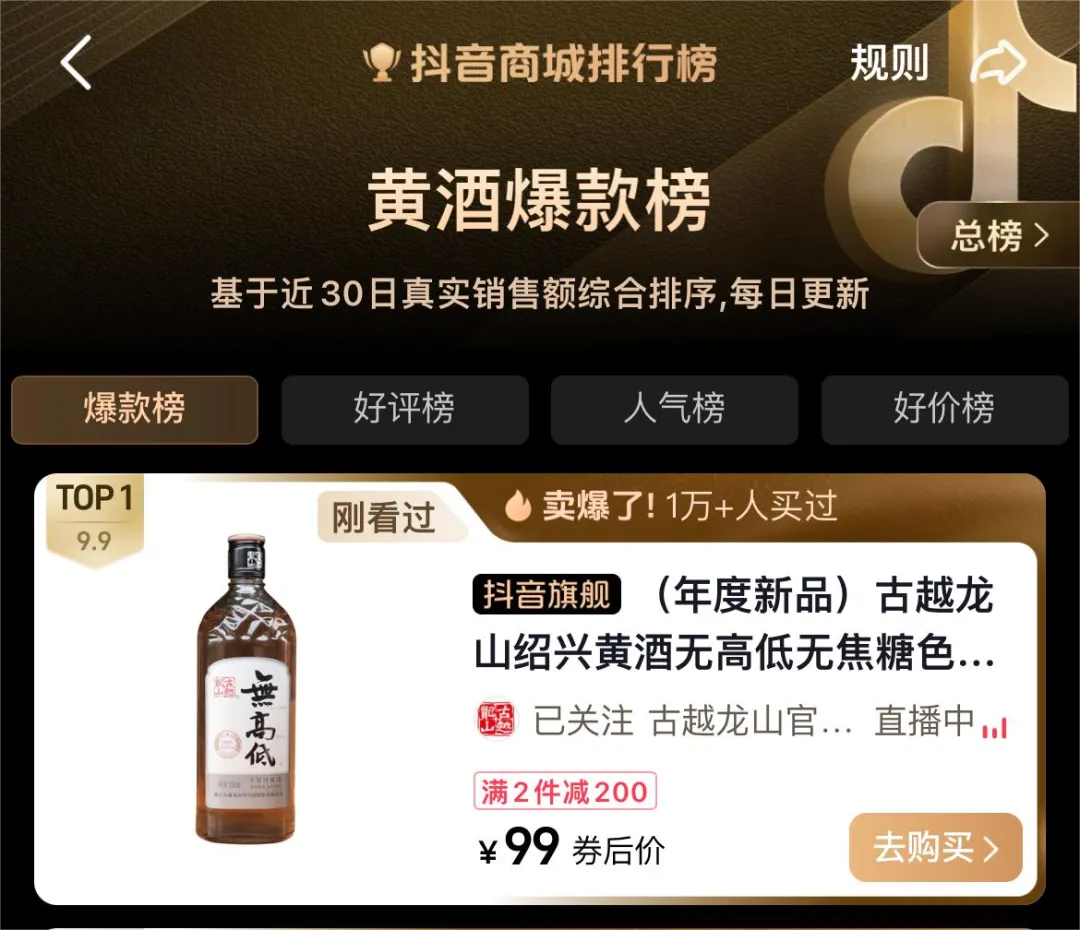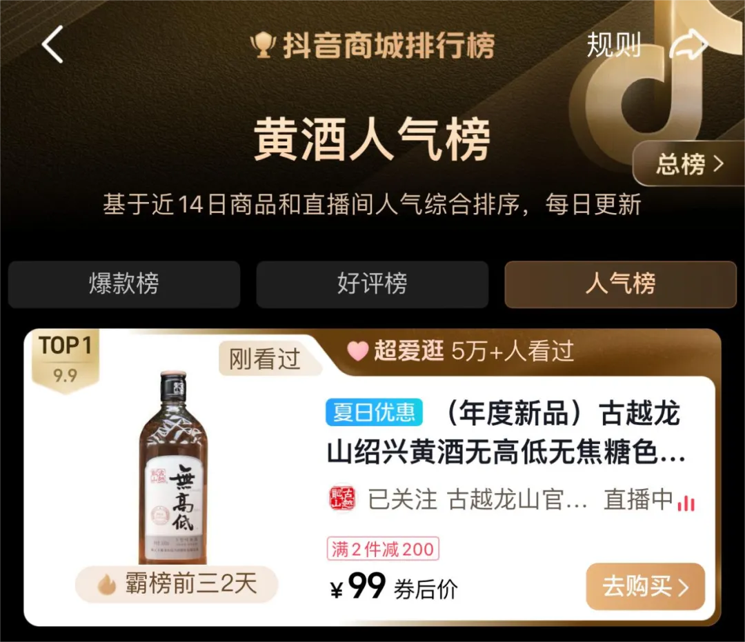 1、古越龙山联手江南大学,千年黄酒酿造技艺新突破,某音商城黄酒爆款榜、人气榜TOP①。