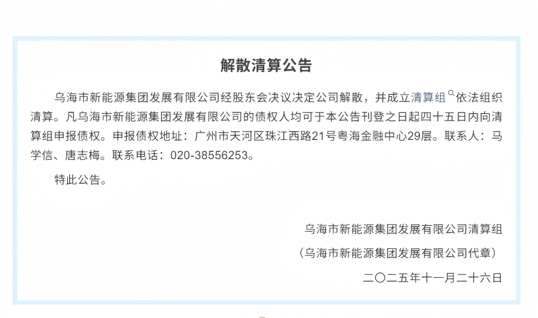 11月26日,乌海市新能源集团发展有限公司清算组发布公告,这家成立于2005年9月的地方能源企业经股东会决议解散,即将走完它近二十年的企业生命。