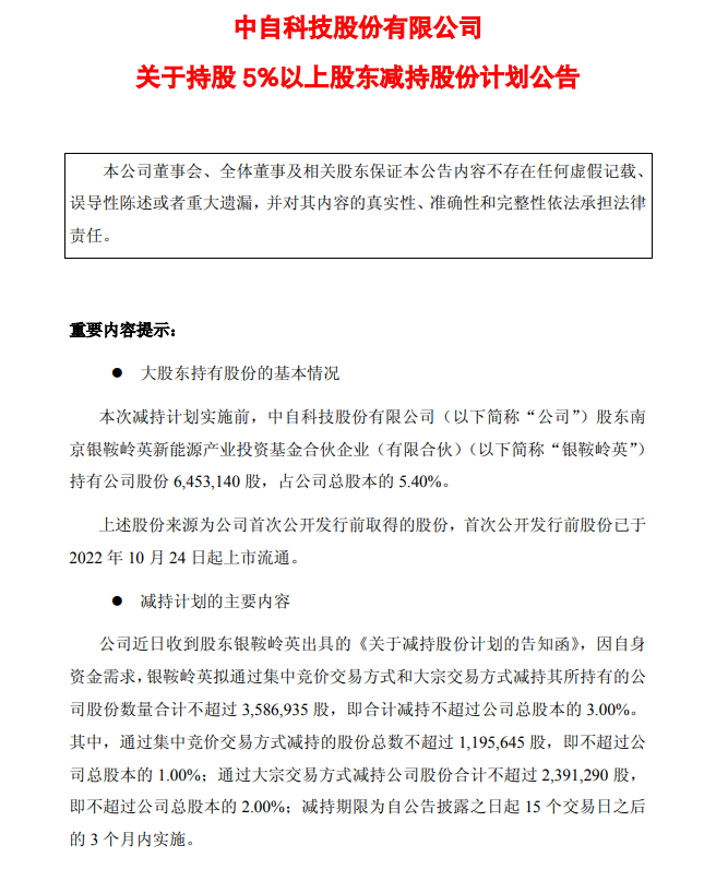 12月8日,中自科技(688737.SH)发布公告,公司近日收到股东银鞍岭英出具的《关于减持股份计划的告知函》,因自身资金需求,银鞍岭英拟通过集中竞价交易方式和大宗交易方式减持其所持有的公司股份数量合计不超358.69万股,即合计减持不超过公司总股本的3.00%。