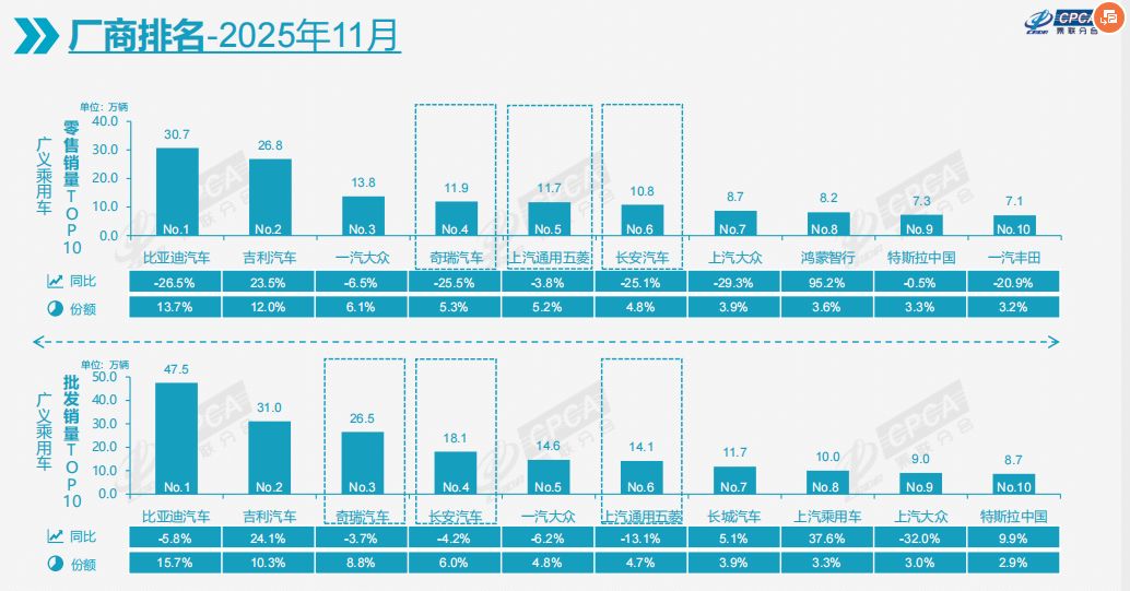从广义乘用车零售销量排名来看,比亚迪、吉利汽车、一汽-大众虽居前三,但其中有两家销量都出现了同比下滑。同样,在销量排名三至十名中,仅有鸿蒙智行销量同比出现了95.2%的大幅增长。