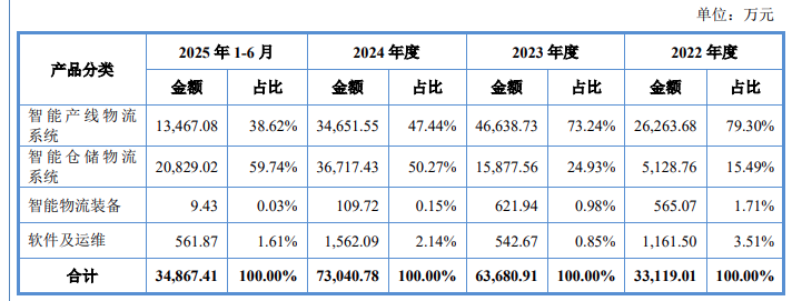 分业务来看,智能产线物流系统与智能仓储物流系统是妥妥的“顶梁柱”,合计占主营业务收入比例超90%。2022-2024年,智能产线物流系统收入分别为2.63亿元、4.66亿元、3.47亿元,占比分别为79.30%、73.24%、47.44%。;智能仓储物流系统收入分别为5,128.76万元,1.59亿元、3.6,7亿元,占比分别为15.49%、24.93%、50.27%。