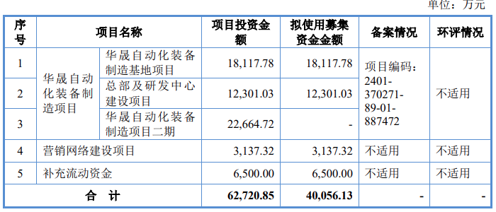 最新版招股书显示,华晟智能本次拟向不特定合格投资者公开发行股票不超过16,666,667股(不含超额配售选择权),或不超过19,166,667股(全额行使超额配售选择权)。华晟智能拟募集资金约4.01亿元,扣除发行费用后募集资金将用于华晟自动化装备制造项目、营销网络建设项目及补充流动资金。