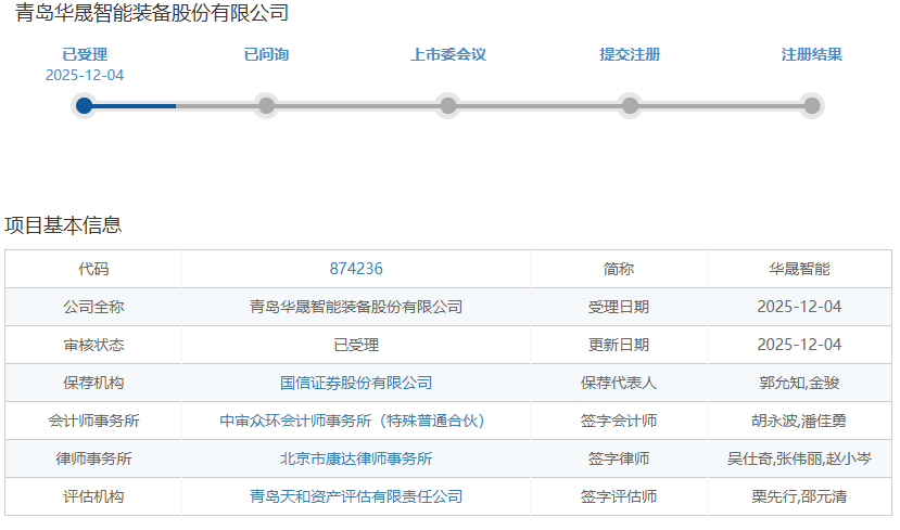 在上市辅导方面,2024年11月,华晟智能与国信证券签署辅导协议并完成备案,历经四期系统性辅导后,于2025年11月20日官宣完成北交所上市辅导,为后续申报扫清合规障碍。同月26日,该公司便正式向北交所报送公开发行股票并上市的申报材料,仅时隔8天就收到北交所出具的《受理通知书》,IPO申请正式进入审核阶段。
