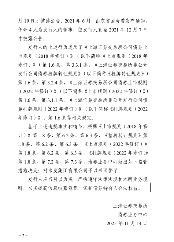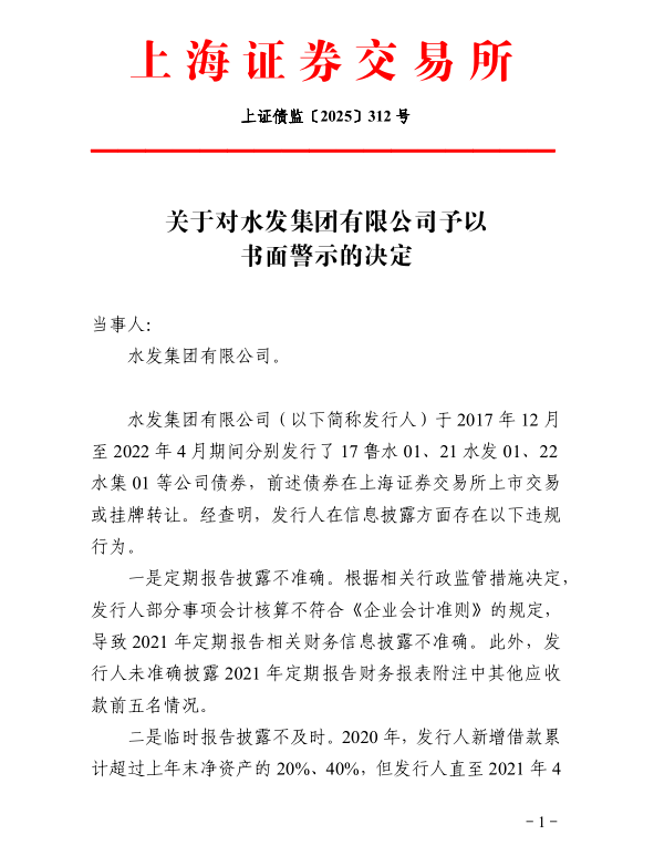 上交所近日公告,对水发集团有限公司予以书面警示。经查明,发行人在信息披露方面存在违规行为。一是定期报告披露不准确。根据相关行政监管措施决定,发行人部分事项会计核算不符合《企业会计准则》的规定,导致2021年定期报告相关财务信息披露不准确。此外,发行人未准确披露2021年定期报告财务报表附注中其他应收款前五名情况。二是临时报告披露不及时。2020年,发行人新增借款累计超过上年末净资产的20%、40%,但发行人直至2021年4月19日才披露公告。2021年6月,山东省国资委发布通知,任命4人为发行人的董事,但发行人直至2021年12月7日才披露公告。