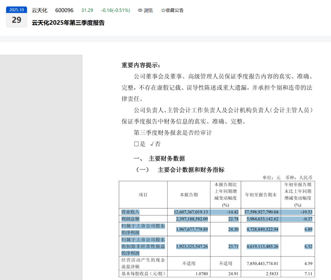 云天化公司2025年7月到9月(第三季度)的经营成绩单。