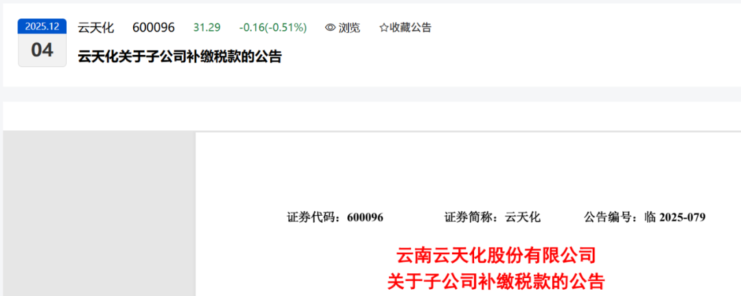 云天化公司的一家子公司,发现自己从2022年到今年10月,有一笔税款没交够。