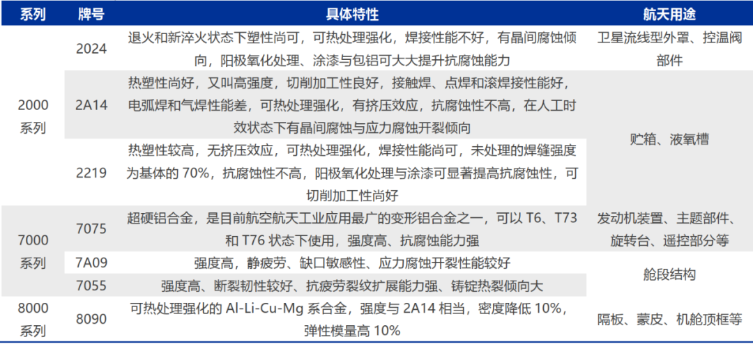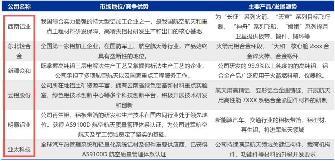 我国航天铝材核心供应商包括西南铝业、东北轻合金、新疆众和等。西南铝业作为行业龙头,为长征火箭、神舟飞船提供铝合金板带、锻件等关键部件;明泰铝业、亚太科技则是新能源汽车铝材领域的领先者,通过 AS9100D 航空航天质量管理体系认证,正稳步进军航空航天及军工领域。
