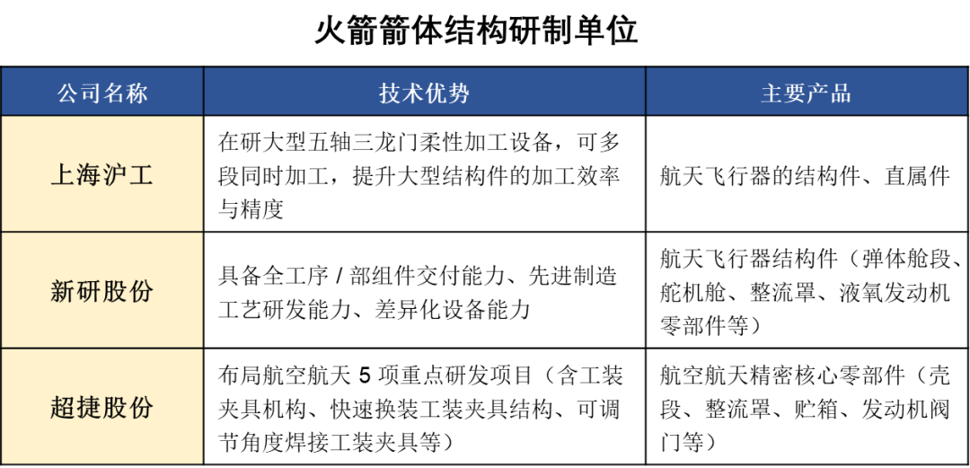 国内运载火箭结构件核心供应商为上海沪工、新研股份、超捷股份:上海沪工是多家航天总装单位的核心供方,提供航天装备设计、研发等全流程服务;新研股份生产弹体舱段、整流罩等飞行器结构件;