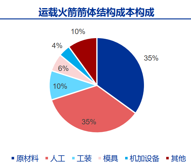 箭体结构是火箭的 “骨架预算”,占其制造成本的 20-30%,由原材料、工装模具、人工、设备损耗等构成。以美国宇宙神 5 火箭为例,这部分成本占比 25-30%,其中原材料、人工各占约 35%。