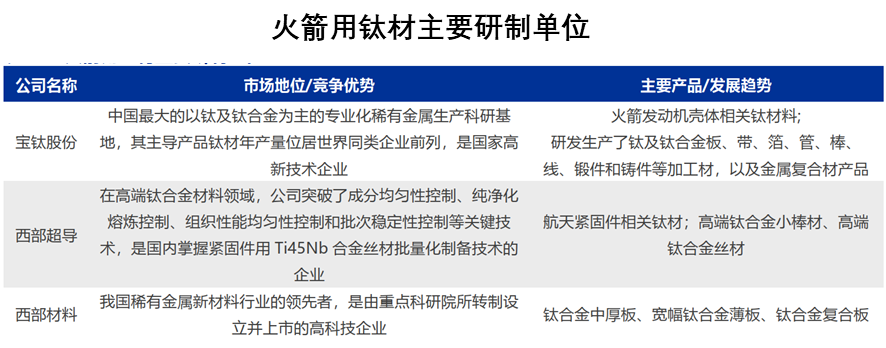 行业集中度较高,宝钛股份作为核心科研生产基地,供应钛合金板、管、锻件等产品,适配火箭贮箱、发动机壳体;西部超导掌握高端钛合金关键技术,其小棒材、丝材主要用于航天紧固件。