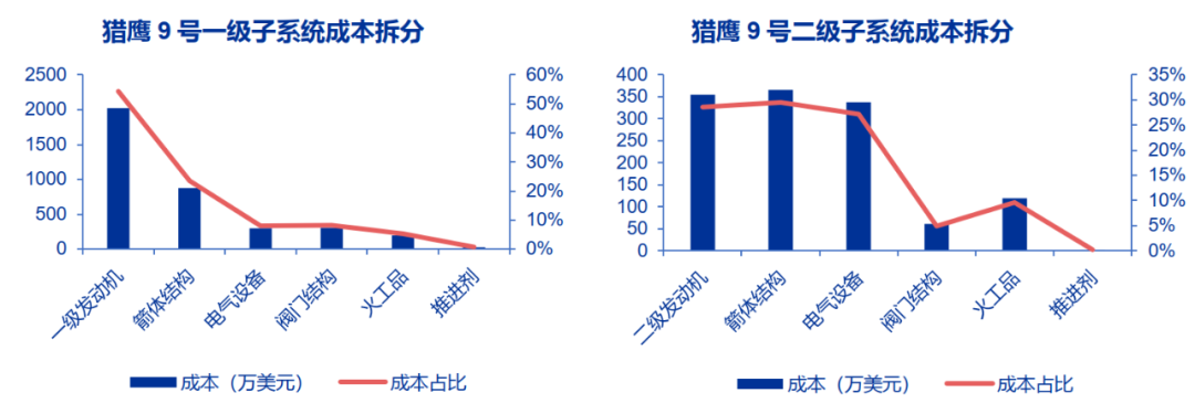 推进系统是火箭成本 “大头”,占总费用的 40%-50%。以 SpaceX 火箭为例:一子级中发动机是成本核心(占 54.3%),其次是箭体结构(23.5%),电气设备、阀门等其他部件占比均较低;二子级里发动机、箭体结构、电气设备成本占比接近(分别 28.6%、29.5%、27.2%),阀门、火工品等占比极小。