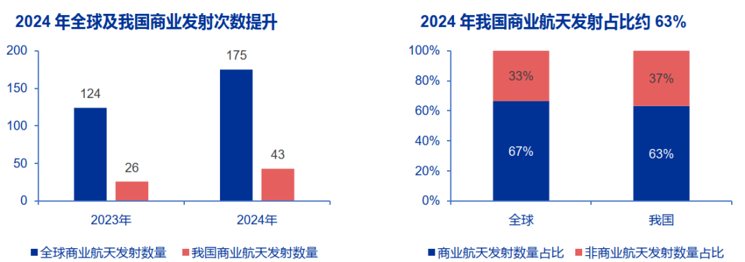 商业航天是全球航天产业的 “主力赛道”,国内这一领域也在加速发展、热度走高。2024 年全球 263 次航天发射中,商业发射占 175 次(占比 67%);国内商业发射达 43 次,占自身发射量的 63%。2018-2023 年,我国商业航天产值从 0.6 万亿增至 1.9 万亿(年均增 23%),预计 2029 年市场规模将超 6.6 万亿。