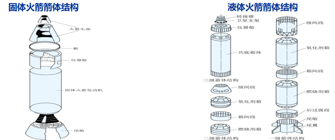 箭体结构是运载火箭的 “骨架 + 集装箱”,把各系统整合为完整整体,是火箭所有受力和支撑结构件的总称。固体火箭的箭体主要包括整流罩、仪器舱 / 推进舱和尾翼;液体火箭在此基础上,还多了箱间段、发动机架等组件。这些部件共同撑起火箭架构,既支撑保护有效载荷,又保障火箭顺利运行。