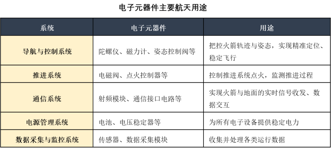 电子元器件是运载火箭的 “神经单元”,是电路核心组件,支撑电子设备、控制系统等关键系统运行。其分为两类:主动元器件(有源器件)需电源才能工作,包括晶体管、二极管、集成电路等;