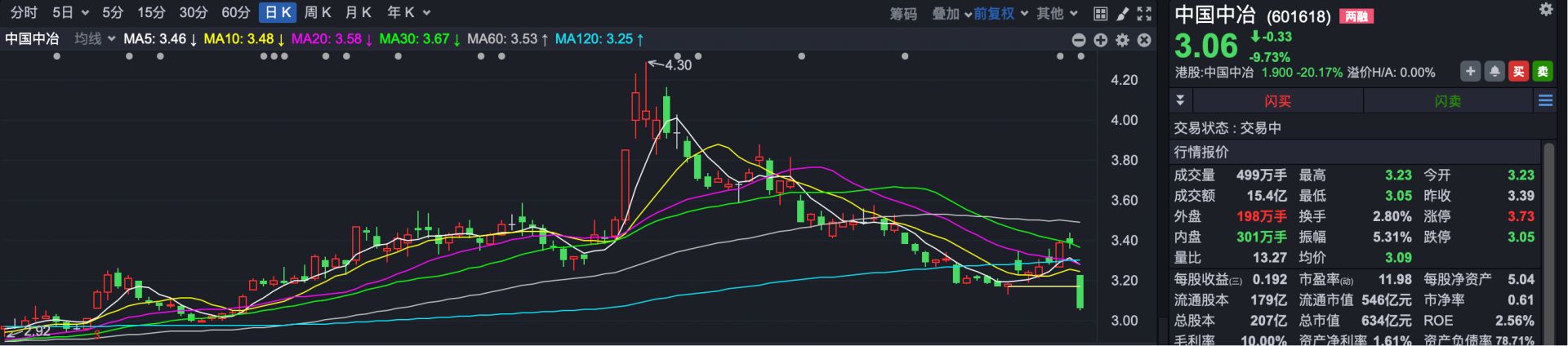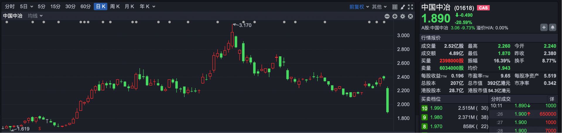 12月9日早盘,中国中冶股价突发异动,A股股价逼近跌停,港股股价一度跌超20%。