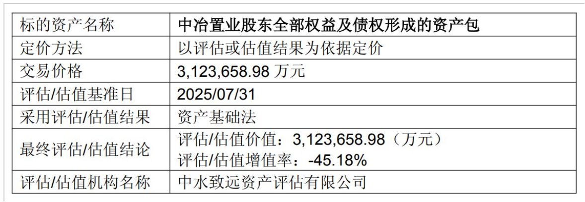 值得注意的是,根据公告,本次交易标的一为中冶置业100%股权以及公司对中冶置业的标的债权,交易对价为312.37亿元。评估报告显示,截至评估基准日2025年7月31日,交易标的一评估减值率高达45.18%。对此,中国中冶坦言,减值的主要原因在于该资产包中所涉资产的市场价值下降。