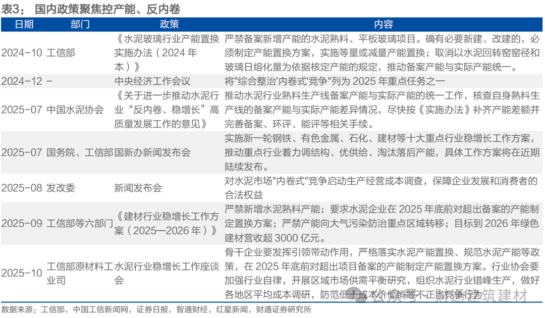 新一轮水泥供给侧改革开启,政策聚焦控产能、反内卷。2024年末以来,水泥相关政策聚焦于严控供给、推动落后产能退出、防止低价倾销这几个核心展开,以应对当前产能过剩、市场内卷的严峻挑战。2025年9月,《建材行业稳增长工作方案(2025—2026年)》出台,核心内容包括加速出清水泥行业低效产能,据百年建筑网,今年水泥行业整体产能利用率维持在50%左右,若贯彻“2025年底前对超出项目备案的产能制定产能置换方案”,预计能减少10%的熟料产能。