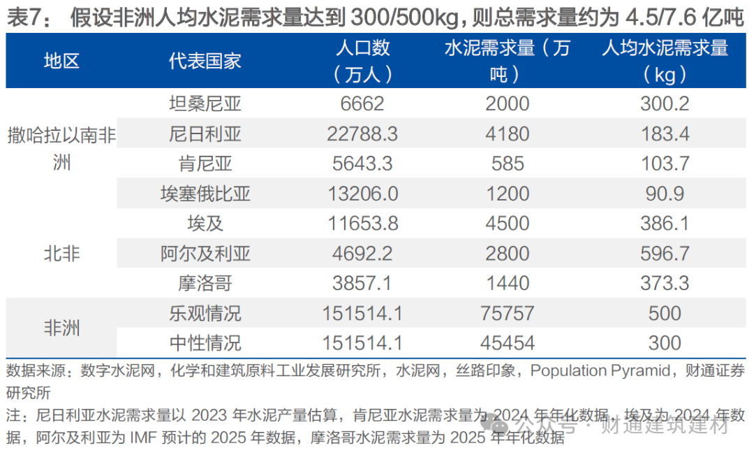 假设非洲人均水泥需求量达到300/500kg,则总需求量约为4.5/7.6亿吨,供需存在缺口。撒哈拉以南非洲人均水泥需求量较低,基本在300kg/人以下;北非经济发展速度较撒哈拉以南非洲快速,人均水泥需求量在300kg/人以上。考虑到后续南非发展有望提速,我们假设乐观情况下未来南非经济对标北非,非洲人均水泥需求量在500kg/人,则非洲整体对水泥的需求量约7.6亿吨;假设中性情况下未来非洲经济平均水平以坦桑尼亚为基准,则人均水泥需求量约在300kg/人,非洲整体对水泥的需求量约4.55亿吨。供给端,2020年非洲水泥产能为3.86亿吨、产量为2.13亿吨,远小于未来需求量,供需存在较大缺口。