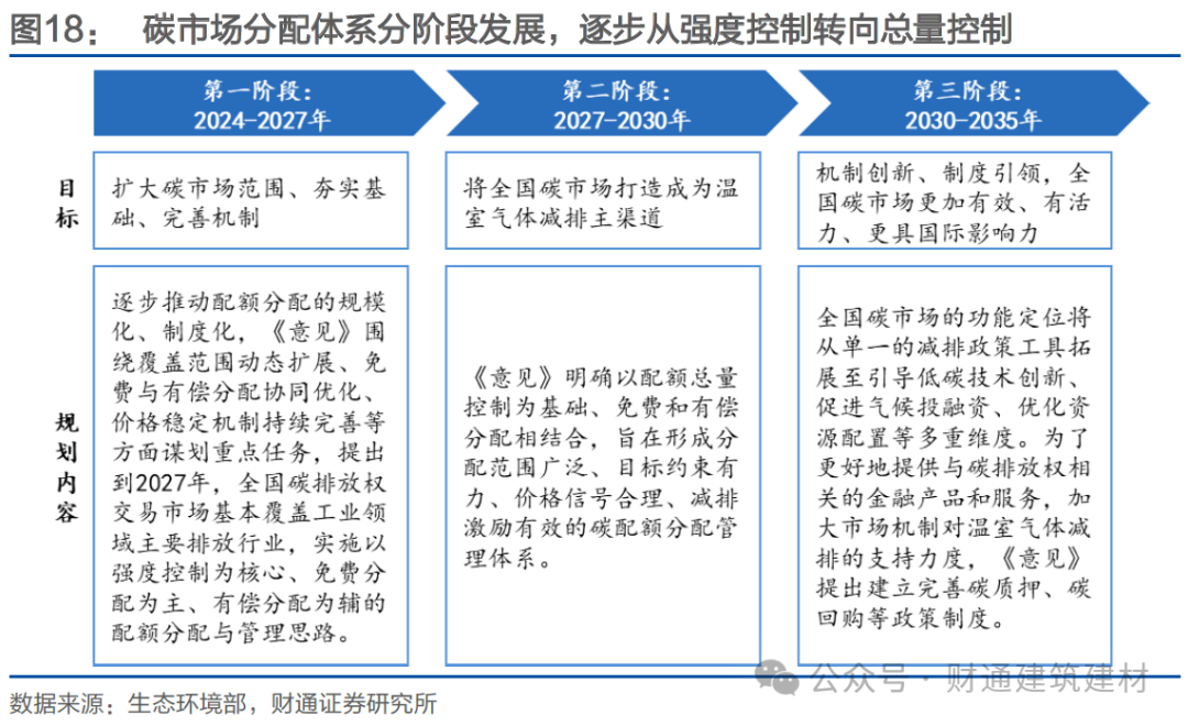 2024年起,水泥行业碳排放控制逐步严格。2024年为水泥行业首个管控年度,配额分配量与其经核查的实际碳排放量相等,所有企业均无配额缺口,无需支付履约成本。2025-2026年采用碳排放强度控制的思路分配配额,企业所获得的配额数量与产能产出挂钩,行业整体配额盈亏基本平衡。2027年及以后,对标行业先进水平优化配额分配方法,推动单位产品产量碳排放不断下降。《关于推进绿色低碳转型加强全国碳市场建设的意见》提出到2027年,对碳排放总量相对稳定的行业优先实施配额总量控制。整体体现了政策从过渡到常态的节奏安排。