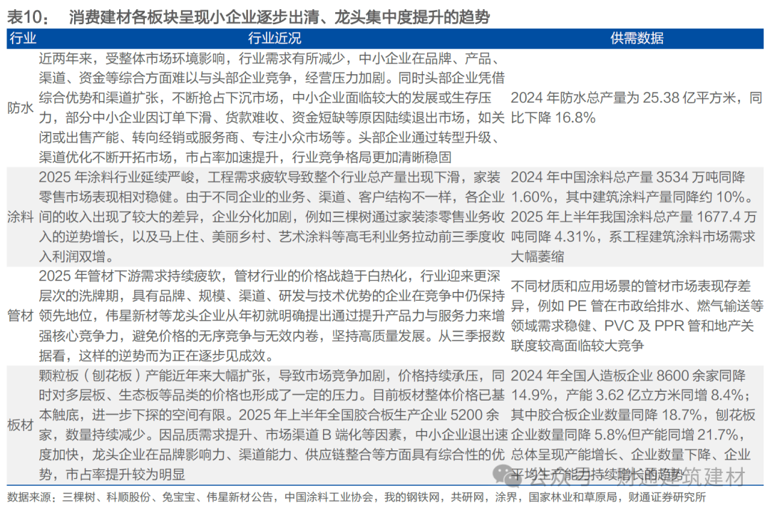 拐点渐显,竞争减缓是大势所趋。2024-2025年防水、涂料、管材、板材等行业需求连续两年下行,行业企业数量持续减少,尤其是在白热化的价格竞争下小企业亏损加剧、加速出清,龙头通过主动和被动的方式提升集中度。