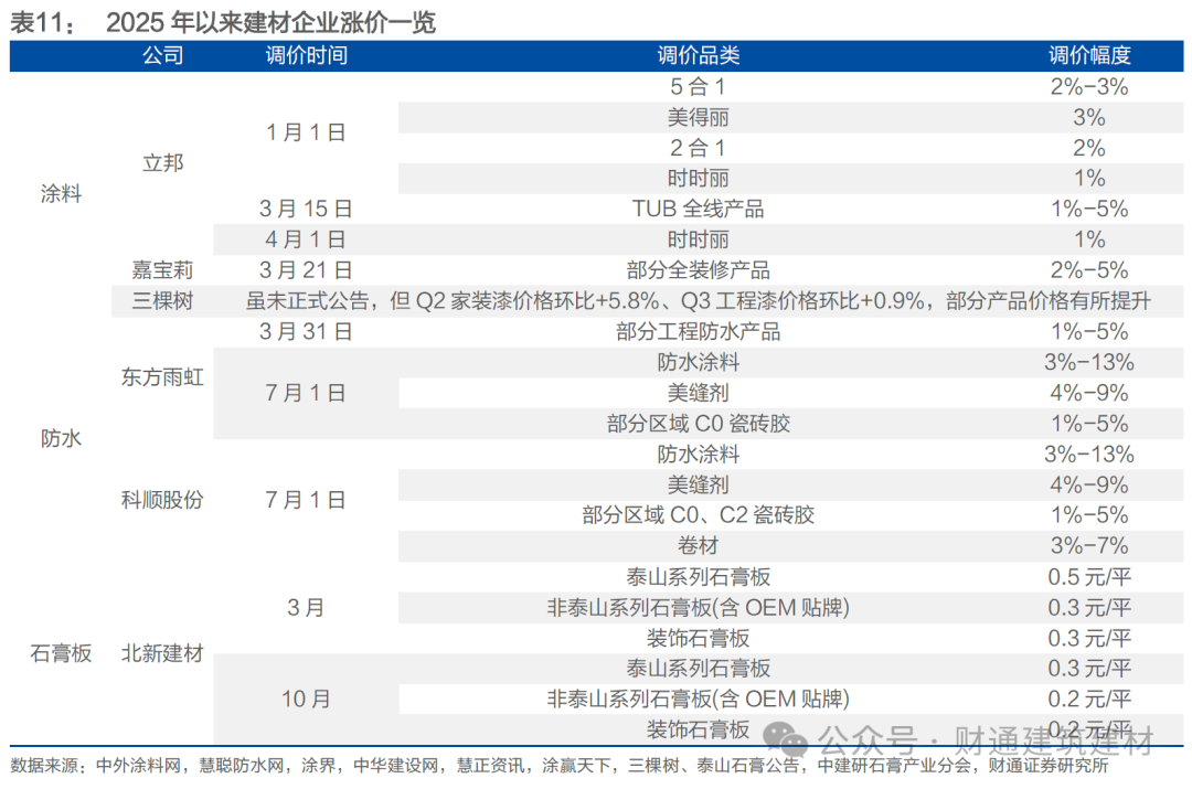 2)从价格回归价值,价格战趋缓:2025年以来,涂料、防水、石膏板等建材子板块存在一定程度上的复价或提价,一方面系经过2024年末价格战,龙头企业发现降价对提量的效果在边际递减,主动提出避免无效内卷的想法;另一方面系扰乱价格体系的小企业出清显著。我们认为,本次建材提价不仅是建材龙头企业盈利边际改善的起点,也显示出当前行业触底回升的迹象,困境反转或已不远。