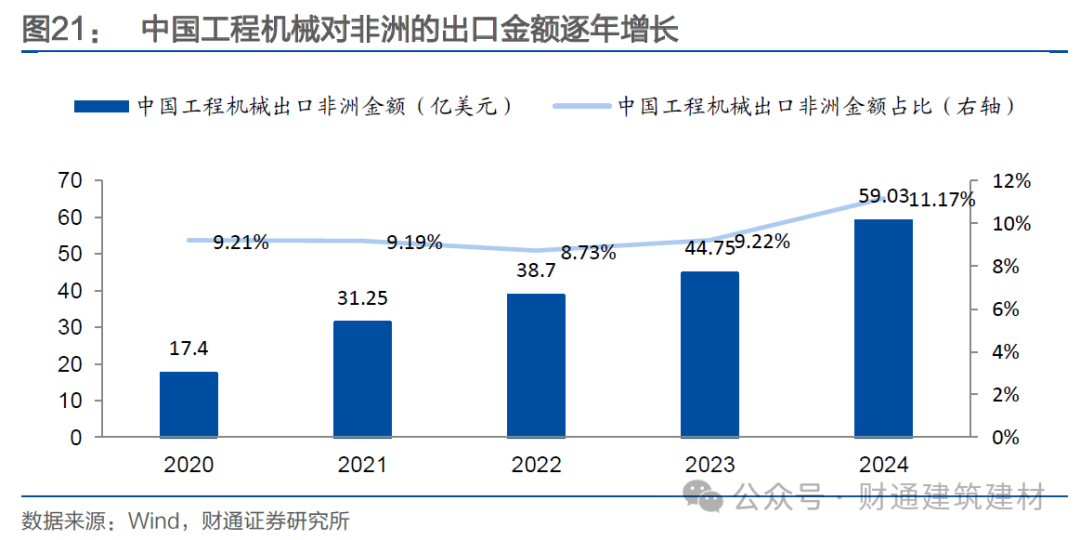 非洲基建需求较大,且主要与中国合作。据世界银行,非洲每年在基建上的支出约为400-500亿美元。2024年我国工程机械对非洲出口金额达59.03亿美元,同增32%,占总出口额的11.17%。在中非合作论坛的合作框架下,有62%的EPC项目采用的是中国标准,根据2024年中非合作论坛峰会规划,中国将在2025-2027年投入3600亿元支持中非十大重点领域合作,包括援建10个产业园区、30个基建项目、1000个民生工程、30个清洁能源项目,并设立绿色产业链专项资金。