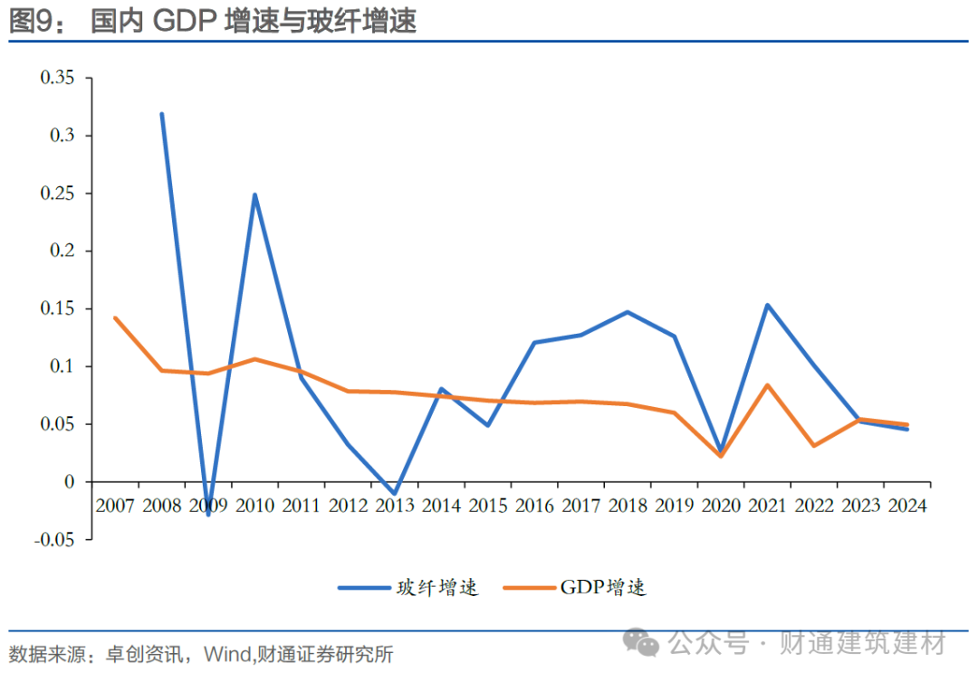 传统需求挂钩经济,反内卷提供新方向。需求方面,欧文斯科宁通过回溯全球1981-2015年的数据发现:全球玻纤需求增速约为工业产值增速的1.6倍。再看中国,过去由于玻纤的下游应用领域窄,与宏观经济整体相关性较低,近年来玻纤行业通过技术创新、智能制造等举措不断提高产品性价比,拓展应用领域,增强对传统材料的替代性,渗透到国民经济的各个组成部分,玻纤需求与整体经济相关性提高,根据近几年数据来看,玻纤增速与GDP增速比值大约在1.5-2.0左右。因而,行业传统需求的回暖取决于经济景气度的回升。
