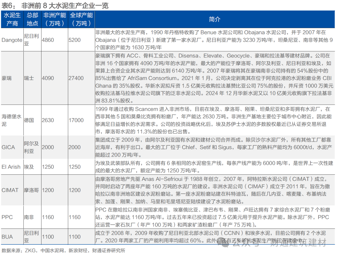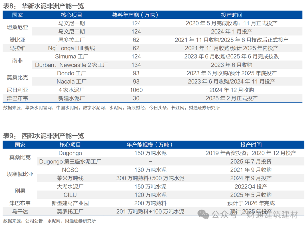 中国水泥企业通过收并购或投资建厂进入。国内水泥需求下行,我国水泥企业发掘非洲持续增长的基建需求,通过收并购和在非洲投资建设新水泥厂进入非洲市场,与Dangote、BUA等当地水泥企业竞争。例如华新水泥2019年通过收购Maweni Limestone进入坦桑尼亚市场,随后陆续进入赞比亚、南非、莫桑比克、津巴布韦等,2024年收购豪瑞旗下尼日利亚水泥资产。西部水泥2019年宣布进军非洲,合资建厂+收并购+直接投资齐发力。2019年与莫桑比克SPI集团合资成立Dugongo公司并投建两条水泥产线;2021年收购NCSC 61.9%股权并在埃塞俄比亚建设5000t/d、10000t/d熟料水泥产线;2024年乌干达自建的6000t/d熟料水泥产线开工。