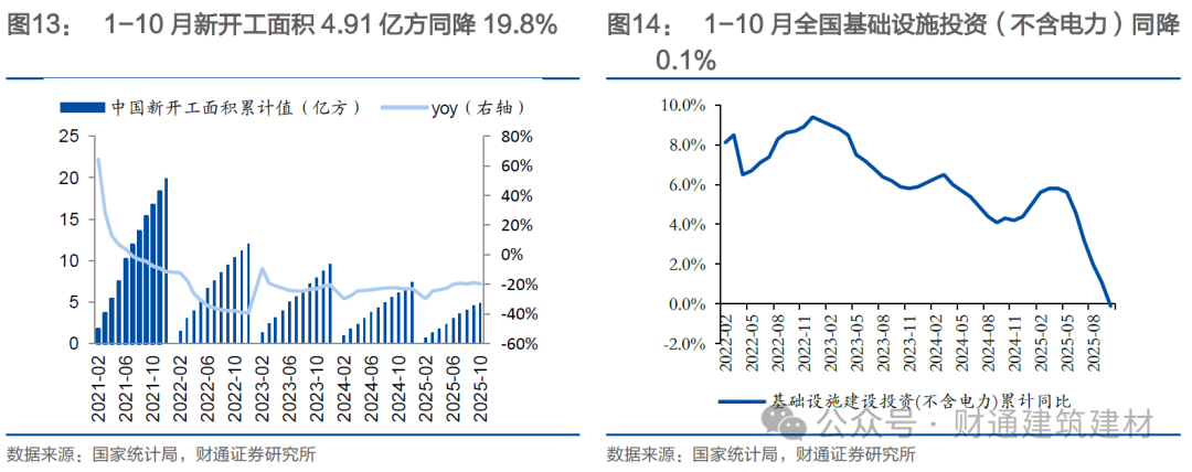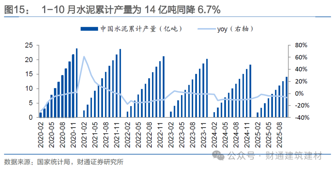 水泥产量持续下滑,需求较为疲软。国家统计局数据显示,1-10月水泥累计产量为14亿吨,同比下降6.7%。前三季度累计产量继续创2010年以来同期新低,主要系水泥需求持续下滑。房地产市场仍处于底部深度调整阶段,1-10月全国房屋新开工面积4.91亿平方米,同比下降19.8%;基础设施投资增速持续放缓,1-10月全国基础设施投资(不含电力)同比下降0.1%。