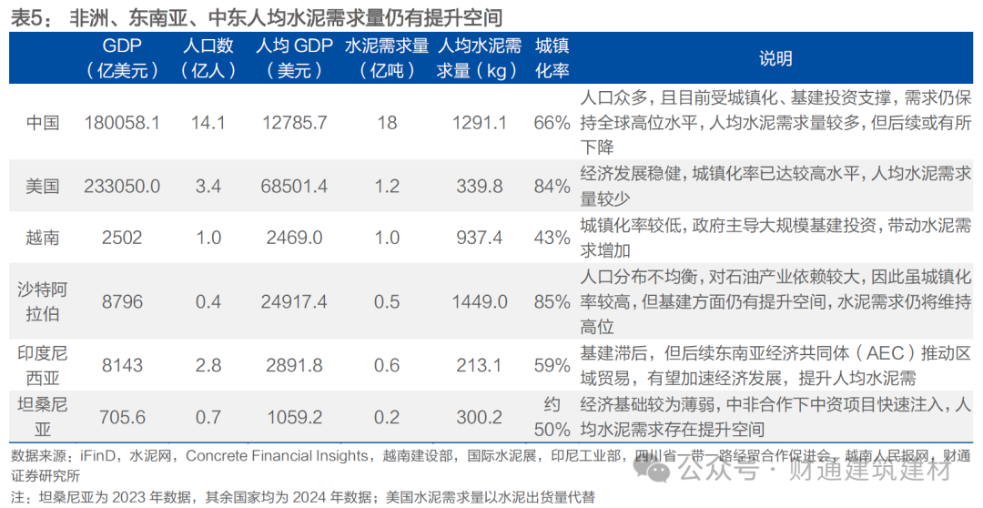 以印尼、越南为代表的东南亚,以坦桑尼亚为代表的非洲,以沙特为代表的中东人均水泥需求量均有提升空间。越南、印尼、坦桑尼亚目前城镇化率较低,且中国加大与东南亚、非洲合作,助力基础设施建设,有助于提升人均水泥需求。对于中东而言,基于对单一石油产业依赖,经济发展较不均衡,基建方面仍有提升空间,水泥需求仍将维持高位。