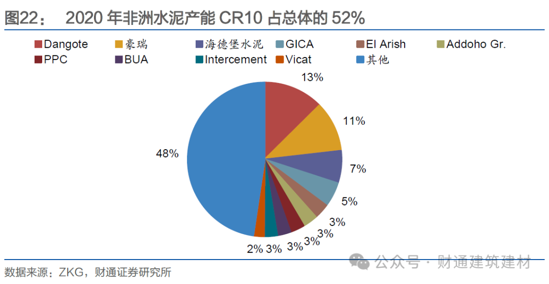 非洲水泥行业较为分散,产能CR10为52%。截至2020年底,非洲水泥产能为3.86亿吨/年。前十大水泥公司合计产能为2.02亿吨/年,占总产能的52%。此外,还有50多家其他供应商,合计产能为1.84亿吨/年,占总产能的48%。