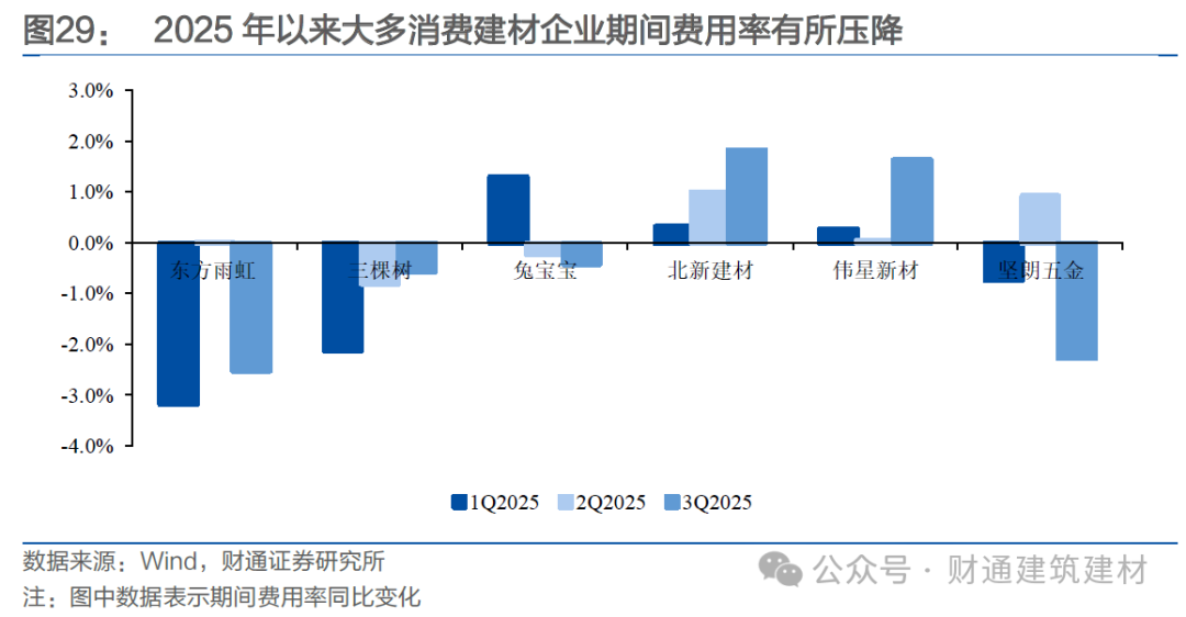 3)降本降费进行时,经营聚焦提质:2025年消费建材企业降低营收增速预期,聚焦提升经营质量和盈利能力,其中最核心的就是落实一系列具体的降本举措。销售费用方面,粗放的投入方式转为精准转化,通过持续优化供应链管理、整合协同资源、优化运费等措施实现成本节约;管理费用方面,企业深化全面预算管理,更注重人效,部分进行冗余人员优化。2025年一-三季度大多消费建材企业期间费用率有所压降。