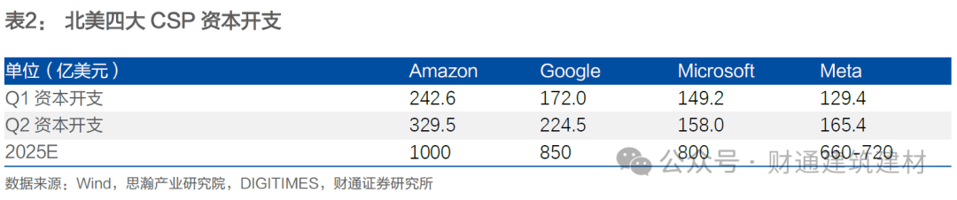 新需求:CSP大厂上修AI资本开支,行业景气度有望延续。近期Google将2025全年资本开支从750亿美元上调至850亿美元,Meta将2025年全年资本开支上调至660-720亿美元,微软预计2025全年资本开支800亿美元,1QFY2026资本支出超300亿美元;AWS预计25年全年资本开支1000亿美元;另外,国内五大CSP厂商资本开支持续攀升。1Q2025阿里资本开支增长126.7%,腾讯同比增长91%,百度预计2025年不断增加资本支出,字节、华为也有大幅投入,且多用于AI基础设施建设。从厂商资本开支角度来看,CSP互联网云长已进入AI军备竞赛状态,智算中心等投入有望持续,行业后续景气度有望延续,进而有望继续带动对上游Low-DK、Low-CET等高端电子布需求。