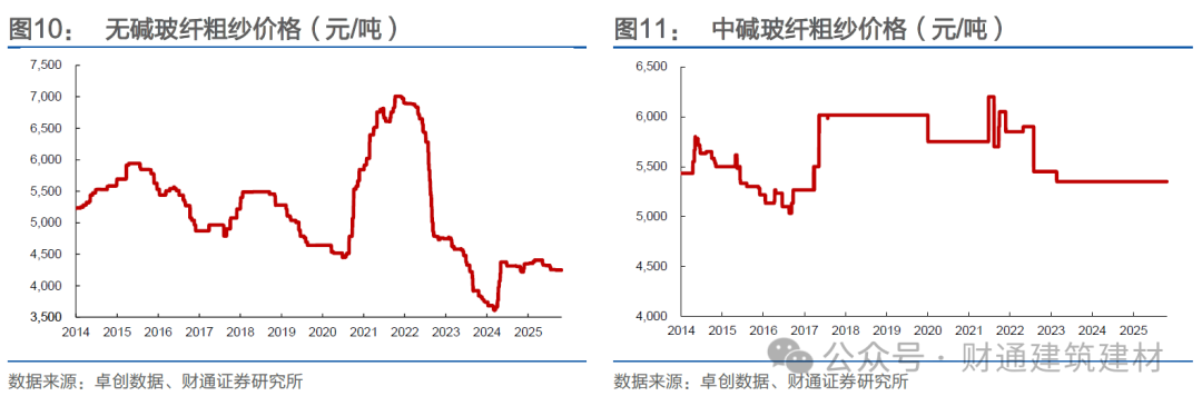 价格方面, 9月初,中国玻璃纤维工业协会发布了《关于玻璃纤维及制品行业反对“内卷式”竞争共同建立和维护公平有序竞争环境的倡议书》, 将反内卷正式引入玻纤行业,并联合行业9家头部企业共同维护行业生态,其中包括:巨石集团、泰山玻纤、国际复材、山东玻纤、长海股份等。具体看,国内玻璃纤维市场粗纱价格稳中有涨,受反内卷推动加之成本压力不断加大下,月初中小厂家纷纷进行价格提涨,行业内几家龙头均宣布涨价,其中中国巨石对风电和热塑短切产品涨价5-10%,对合股纱和普通直接纱产品涨价100-200元;重庆国际对风电直接纱、热塑短切纱和传统粗纱涨价5-10%;泰山玻纤对粗纱、毡布制品涨价不高于10%,对短切纤维、风电玻板用直接纱产品涨价5-10%。