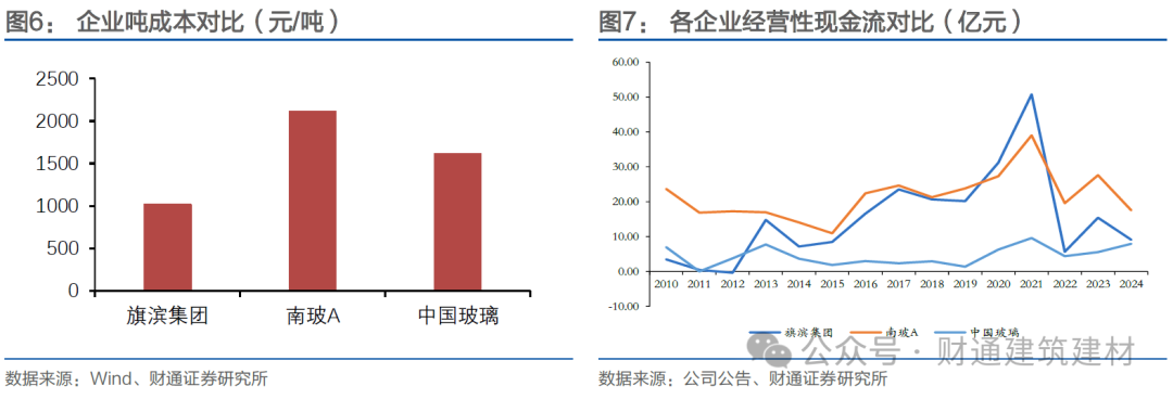 穿越周期:龙头成本优势显著,行业底部更具抗风险能力。行业下行阶段,企业的成本是最佳的安全垫,且在行业处于普遍亏损的情况下,具有成本优势的企业依旧具有正向现金流流入,在行业需求复苏后可快速修复利润。对比来看,2021年旗滨集团、南玻A、中国玻璃的吨生产成本以(以4mm的白玻为基准进行换算)分别为1012/2111/1606元/吨。旗滨集团成本优势更为突出,而对比业内小企业,龙头企业的成本优势将进一步凸显。