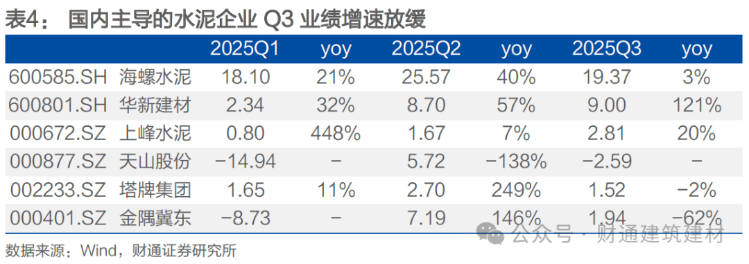 短期看,国内水泥企业改善利润的意愿较为强烈,Q3盈利表现普遍不佳,预计将通过加强行业自律和错峰生产力度,持续推进价格缓慢上调,以提振盈利水平。海螺水泥/塔牌集团/金隅冀东3Q2025归母净利润分别同比+3%/-2%/-62%,均环比Q2有所下降。
