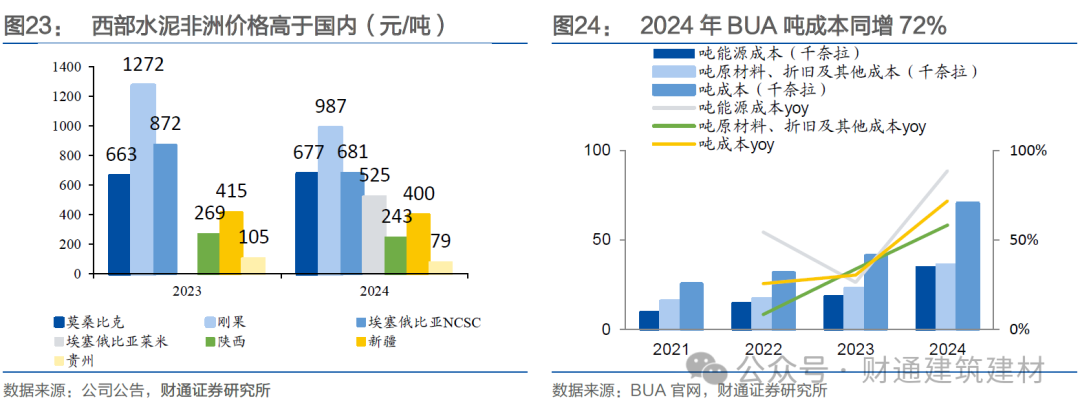 非洲水泥价格维持高位,供给少、垄断竞争、高成本支撑高价格。以西部水泥为例,2024年莫桑比克/刚果/埃塞俄比亚NCSC水泥均价(不含税)分别为677/987/681元/吨,而同期陕西/新疆/贵州水泥均价为243/400/79元/吨。主要原因在于1)供不应求:供给少的核心原因是非洲政局较不稳定、政权更迭频繁,投资风险较高,很多国际水泥企业退出欧洲市场,部分非洲地区本土产能不足;2)竞争格局:部分地区存在垄断,如尼日利亚由Dangote、BUA、拉法基三巨头控制定价权,2025年6月50kg袋装水泥涨至10500奈拉(约210千奈拉/吨、145美元/吨,环增8.25%),政府施压仍难降价;3)成本高昂:非洲货币贬值导致以美元结算的天然气、石灰石等成本上升,例如2024年BUA吨成本同增72%,其中吨能源成本同增89%、吨原材料及折旧等其他成本同增58%。因此非洲水泥价格有望持续维持高位,且短期难以下跌。