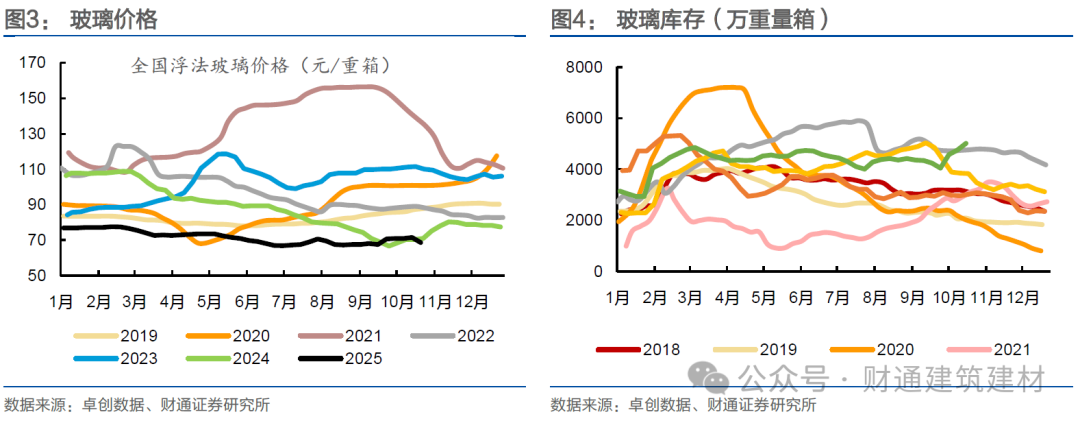 玻璃行业库存水平自2021年以来整体呈现上升趋势,行业供需矛盾突出。具体来看,2021年行业平均库存为2036万重箱,2022年受疫情影响短期供需矛盾突出,年平均库存提升至4679万重箱,2023年小幅回落至3498万重箱,2024年以来受需求影响,库存持续提升,2024年为3863万重箱、2025年第三季度为4321万重箱。在地产需求趋势性下滑的情况下,尽管供给端有所调整,但产能收缩力度仍不足以完全扭转供需矛盾,导致库存持续处于高位,并对产品价格及企业盈利形成持续压制。