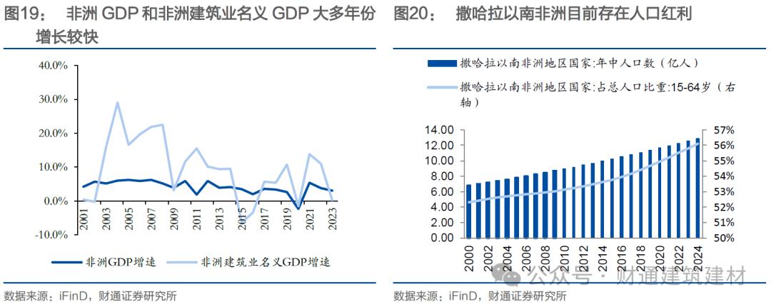 未来撒哈拉以南非洲GDP增速维持4%以上,人口红利提供较大工业化潜力。2024年非洲是全球经济增速第二快的大洲,仅次于亚洲。其中,非洲40个地区国家2024年有望实现同比更快的经济增速,非洲开发银行预计17个经济体增速超过5%,IMF预测撒哈拉以南非洲经济增速将在2025年回升至4.2%。2024年撒哈拉以南非洲人数接近13亿人,其中约56%为15-64岁人口,且该占比逐年提升,年轻劳动力资源丰富,提供了较大的消费市场潜力和工业化潜力。