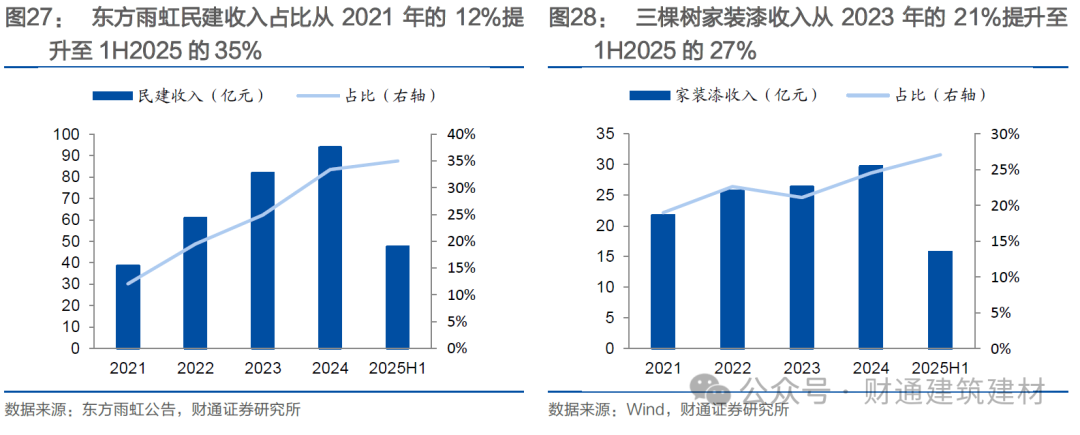 1)渠道结构改善,零售比重大幅提升:消费建材企业正从过去重度依赖大B模式,向零售倾斜,核心目的是提升盈利能力、降低经营风险、提升现金流质量。东方雨虹民建占比从2021年的12%提升至1H2025的35%,瓷砖胶、腻子粉等品类横向扩充叠加“半日达”服务效果显著,同时渠道网络从一二线城市延伸至县域、乡镇、社区等;三棵树家装漆收入从2023年的21%提升至1H2025的27%,存量市场空间广阔,马上住针对二手翻新及旧改,提供包工包料服务,同时美丽乡村提前布局农村自建房蓝海,创新的商业模式使得公司在2025年前三季度实现收入业绩双增。