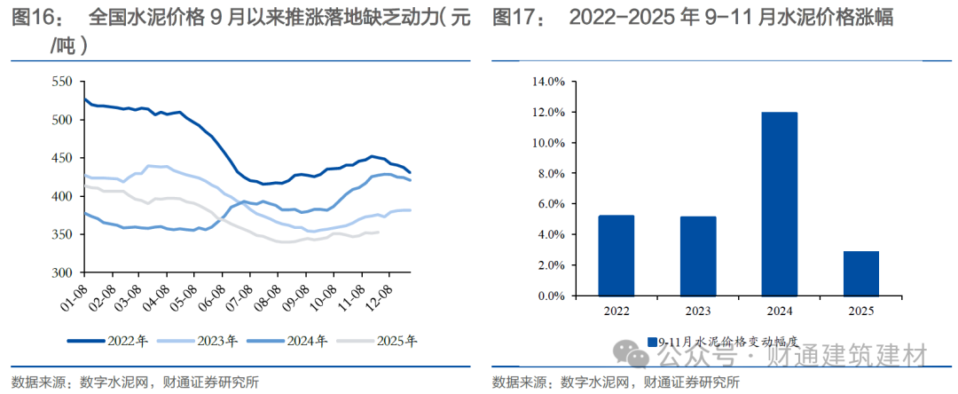供给收缩不及预期,9月以来价格推涨较慢。需求疲软叠加错峰生产等调控措施执行力度较低,部分企业未能严格遵守停窑计划,供需矛盾加剧,导致全国库存连续高位运行,5月以来价格持续下行。虽然9月份价格呈现“筑底回升”走势,但幅度较为缓慢,推涨较为乏力,主要系供给端收缩力度不明显,2025年9-11月水泥价格涨幅2.8%,低于前几年同期。