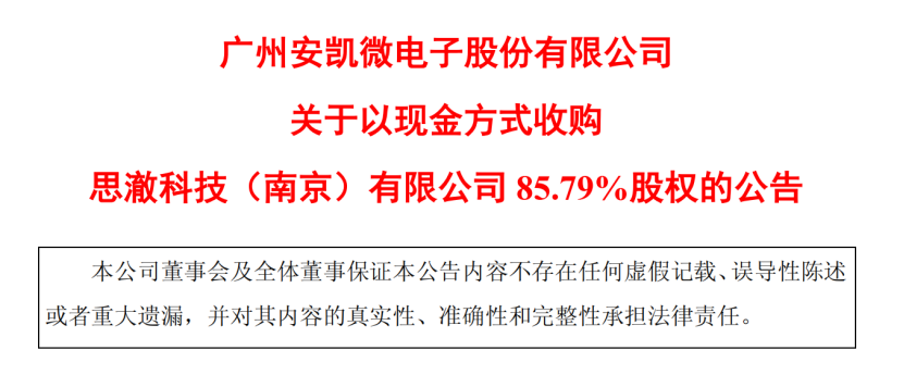 近日,广州安凯微电子股份有限公司发布关于了以现金方式收购思澈科技(南京)有限公司85.79%股权的公告。广州安凯微电子股份有限公司拟以现金方式收购思澈科技(南京)有限公司85.79%股权,收购对价合计为人民币325,991,258.12 元次。