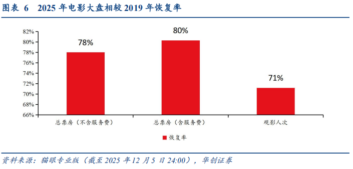 根据猫眼专业版,截至12月5日,2025年电影大盘实现票房(不含服务费)437.06亿元,观影总人次11.57亿人;2019年同期电影票房(不含服务费)为560.26亿,观影总人次为16.25亿人。复苏节奏看,票房大盘已恢复约78%,观影人次已恢复约71%。