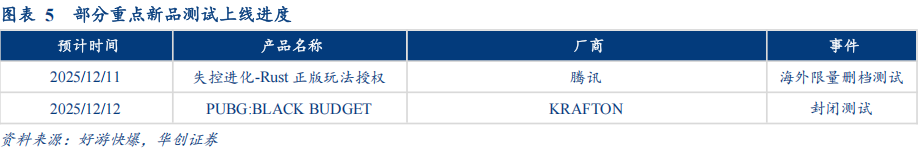 新游方面,《失控进化-Rust正版玩法授权》将于12月11日在海外开启限量删档测试,《PUBG:BLACK BUDGET》将于12月12日开始Steam封闭测试。