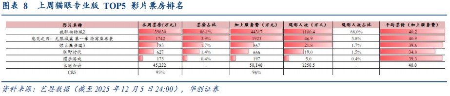 根据猫眼专业版票房排名,2025.12.1-2025.12.5(周一到周五)院线上映电影TOP5分别为《疯狂动物城2》、《鬼灭之刃:无限城篇 第一章 猗窝座再袭》、《惊天魔盗团3》、《狂野时代》、《猎杀游戏》,五部影片票房(不含服务费)分别39830万/1742万/783万/627万/175万,当周票房比例分别88.1%/3.9%/1.7%/1.4%/0.4%。