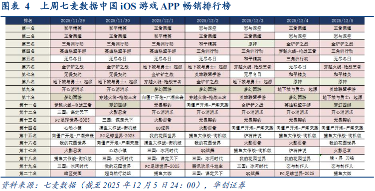 根据七麦数据,2025年11月29日至12月5日中国iOS游戏畅销榜显示,腾讯系产品依旧占据绝对优势,《和平精英》与《恋与深空》本周表现强势,多次超越《王者荣耀》位居榜首,《三角洲行动》也稳居前列。头部格局中,《金铲铲之战》《无尽冬日》《英雄联盟手游》排名出现一定波动。《地下城与勇士:起源》排名相比上周略有下降。