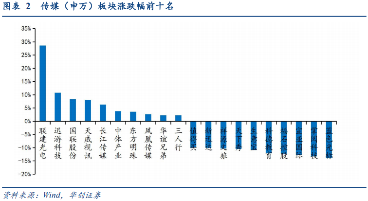从个股看,联建光电(28.62%)/迅游科技(10.76%)/国联股份(8.34%)/天威视讯(8.06%)/长江传媒(6.27%)领涨。蓝色光标(-13.98%)/掌阅科技(-13.3%)/宣亚国际(-12.7%)/福石控股(-12.26%)/科德教育(-12.15%)领跌。
