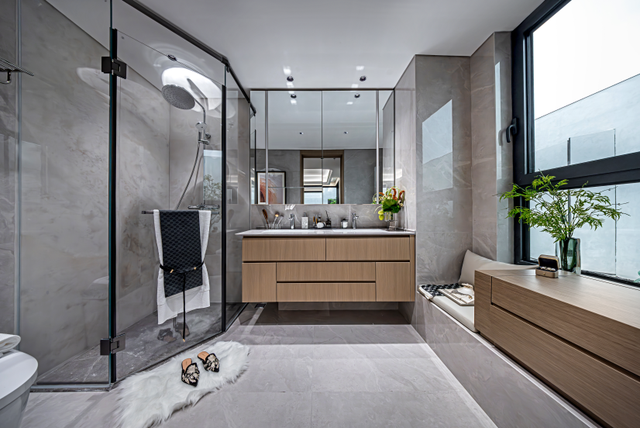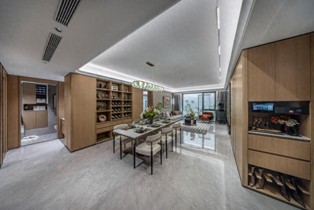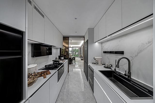 以建筑面积约97平方米户型为例,厨房空间采用科学合理的黄金工作三角设计,将冰箱、水槽、灶具位置优化:冰箱位于厨房入口处,水槽与灶具对向设置,可同时容纳多人操作,清洗、炒菜互不干扰,搭配高效收纳系统,让烹饪流程轻松顺畅。同时,项目通过62项满装细节,实现了大容量、精细化的收纳体系,即使对小空间也进行了极致开发。